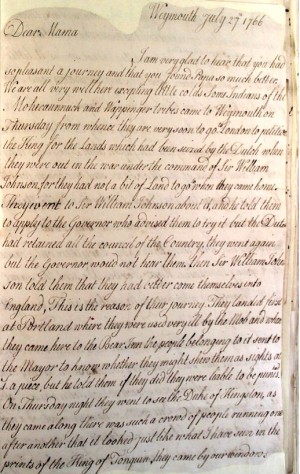 You have rea’y imposed a Task upon me which I can by no means perform viz: that of writing a Merry & Comical Letter: how shou’d [I] my dear that am ever Confined either at School or with my Grandmama know how the World goes on? Now I will give you the History of one Day the Repetition of which without variations carries me through the Three hundred and sixty five Days, which you know compleats the year. Well then first begin, I am awakened out of a sound Sleep with some croaking voice either Patty’s, Milly’s, or some other of our Domestics with Miss Polly Miss Polly get up, tis time to rise, Mr Price is down Stairs, & tho’ I hear them I lie quite snugg till my Grandmama uses her Voice, then up I get, huddle on my cloaths & down to Book, then to Breakfast, then to School again, & may be I have an Hour to my self before Dinner, then the Same Story over again till twilight, & then a small portion of time before I go to rest, and so you must expect nothing from me but that I am Dear Cousin, Most Affectionately Yours